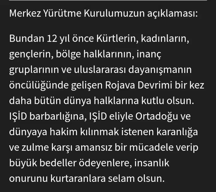 DEM Parti’den bugün yapılan ve daha sonra silinen açıklamada, “19 Temmuz 2012’de Esad diktatörlüğüne karşı Kobanî’den başlayan ve kısa sürede tüm Kuzey ve Doğu Suriye’ye yayılan #RojavaDevrimi, Ortadoğu halklarına umut, özgürlük ve eşitlik perspektifi sundu” ifadeleri kullanıldı.