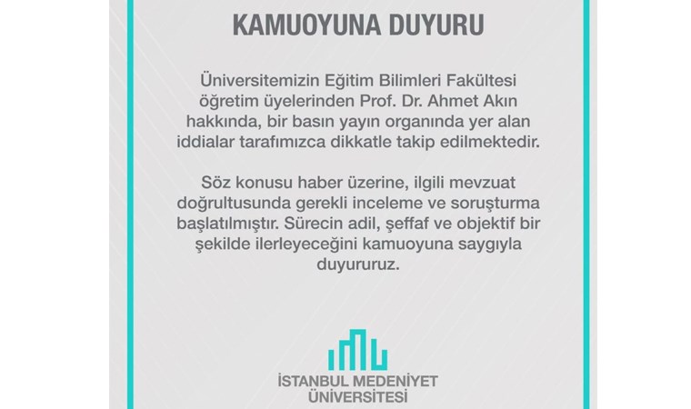 “Üniversitemizin Eğitim Bilimleri Fakültesi öğretim üyelerinden Prof. Dr. Ahmet Akın hakkında, bir basın yayın organında yer alan iddialar tarafımızca dikkatle takip edilmektedir. Söz konusu haber üzerine, ilgili mevzuat doğrultusunda gerekli inceleme ve soruşturma başlatılmıştır. Sürecin adil, şeffaf ve objektif bir şekilde ilerleyeceğini kamuoyuna saygıyla duyururuz.“