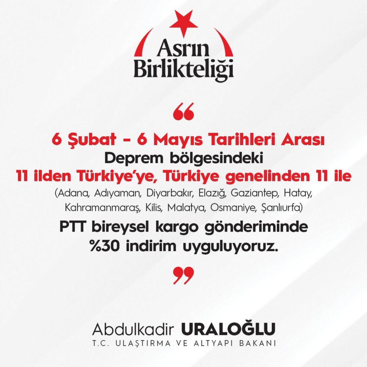 Buna göre 6 Şubat-6 Mayıs tarihleri arasında; Adana, Adıyaman, Diyarbakır, Elazığ, Gaziantep, Hatay, Kahramanmaraş, Kilis, Malatya, Osmaniye, Şanlıurfa, İlleri çıkışlı ve varışlı bireysel gönderilere güncel tarife üzerinden yüzde 30 oranında indirim uygulanacak.