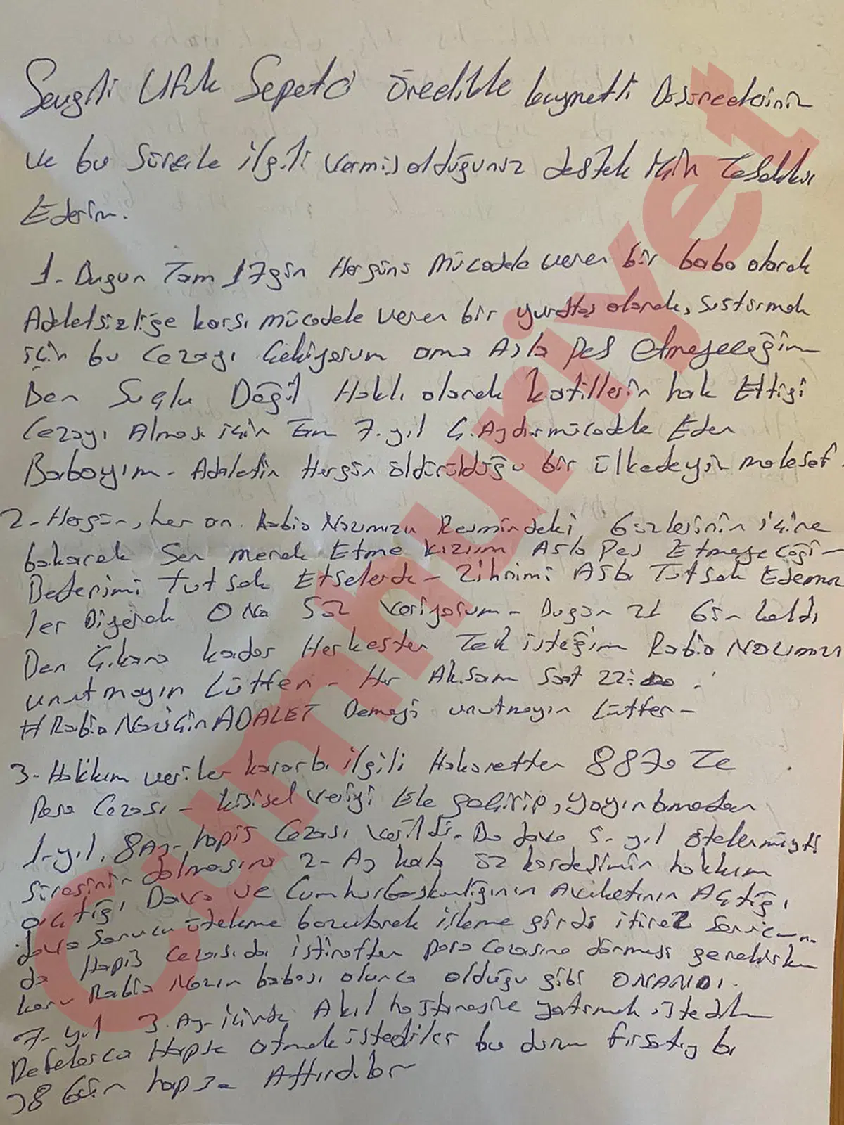Mektubunda, kızının ölümünü aydınlatmak için verdiği yedi yılı aşkın mücadelenin susturulmak istendiğini belirten Vatan, “Cezayı suçlu olduğum için değil, haklı olduğum için çekiyorum” dedi.