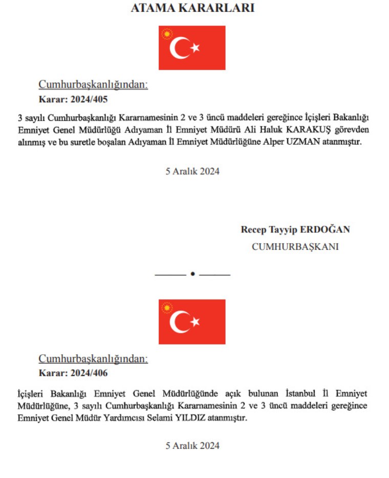 AKP’li Cumhurbaşkanı Erdoğan’ın imzaladığı görevden alma ve atama kararları Resmi Gazete’de yayımlandı. İki ilde Emniyet Müdürlüğü değişikliği yapıldı.
