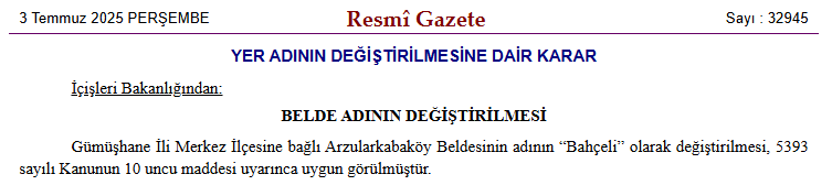 Buna göre, Gümüşhane’nin Arzularkabaköy Beldesi’nin adı Bahçeli olarak değiştirildi.