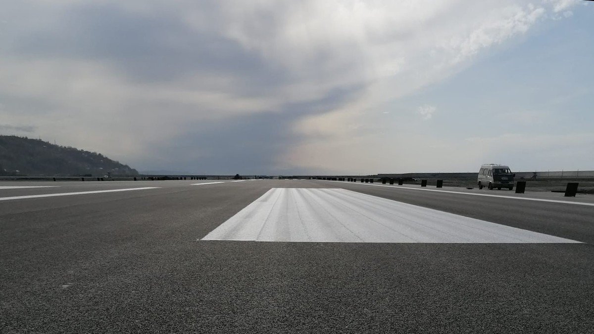 Altyapı inşaatında sona gelinen ve pist, taksi yolları imalatı tamamlanan havalimanında şerit saha düzeltmeleri devam ederken, pistin ve apronların çizgileri de çekilmeye başlandı.