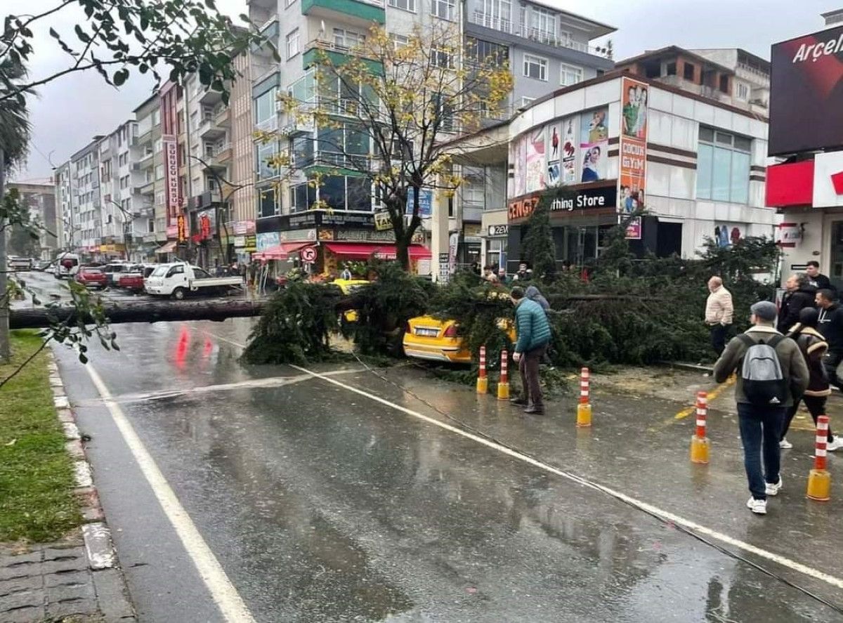 Ardeşen merkezde bulunan ağaç fırtına nedeniyle devrilerek durağına çarptı.