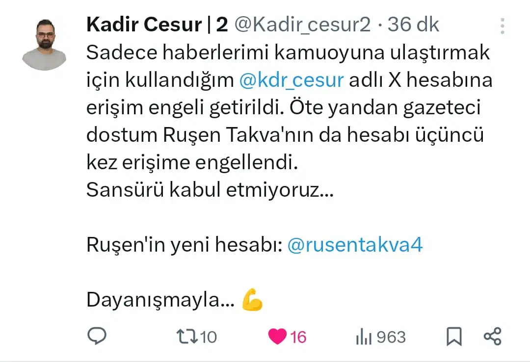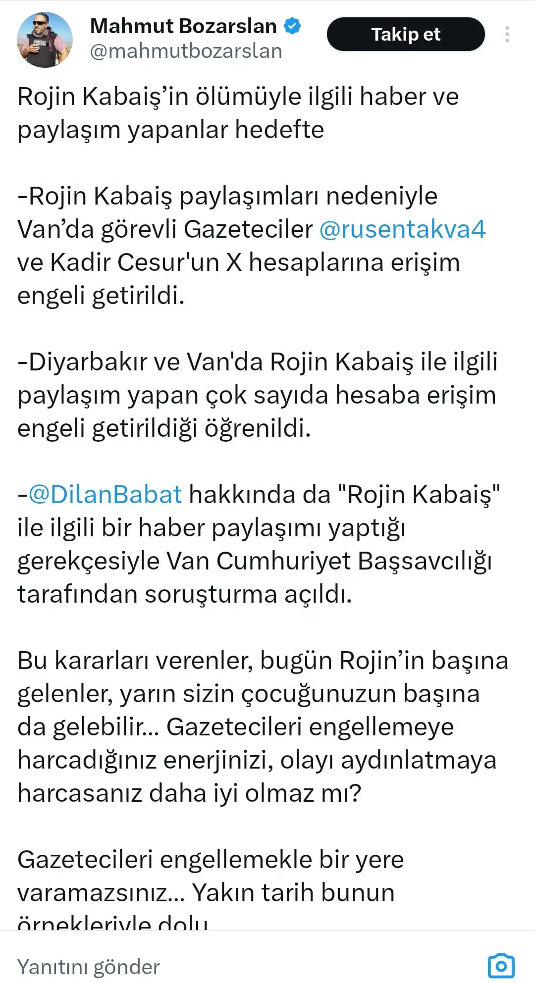 Gazeteci Ruşen Takva, Kadir Cesur’in paylaşımları da erişim engeli getirilen paylaşımlar arasında yer aldı. Dilan Babat hakkında da Rojin Kabaiş ile ilgili yaptığı haber gerekçe gösterilerek soruşturma başlatıldı.