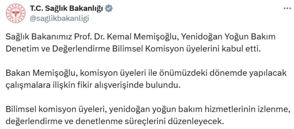 Sağlık Bakanlığının sosyal medya hesabından yapılan açıklamaya göre, Sağlık Bakanı Memişoğlu, Yenidoğan Yoğun Bakım Denetim ve Değerlendirme Bilimsel Komisyon üyeleriyle ileriki dönemde yapılacak çalışmalara ilişkin fikir alışverişinde bulundu.