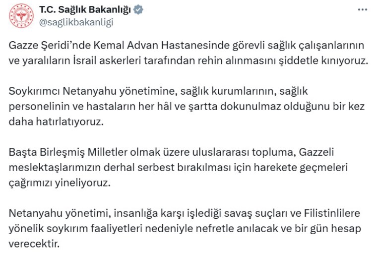 Sağlık Bakanlığı resmi X hesabından yaptığı açıklama ile İsrail’in Gazze Şeridi’nde Kemal Advan Hastanesi’nde görevli sağlık çalışanlarını ve yaralıları rehin alınmasını kınadı.
