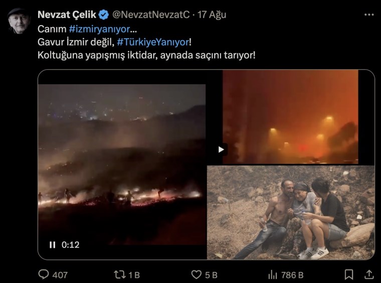 Şair Nevzat Çelik, 17 Ağustos’ta X (Twitter) hesabından yaptığı paylaşımda, “Canım İzmir yanıyor. Gavur İzmir değil, Türkiye yanıyor! Koltuğuna yapışmış iktidar, aynada saçını tarıyor” tabirlerini kullandı.