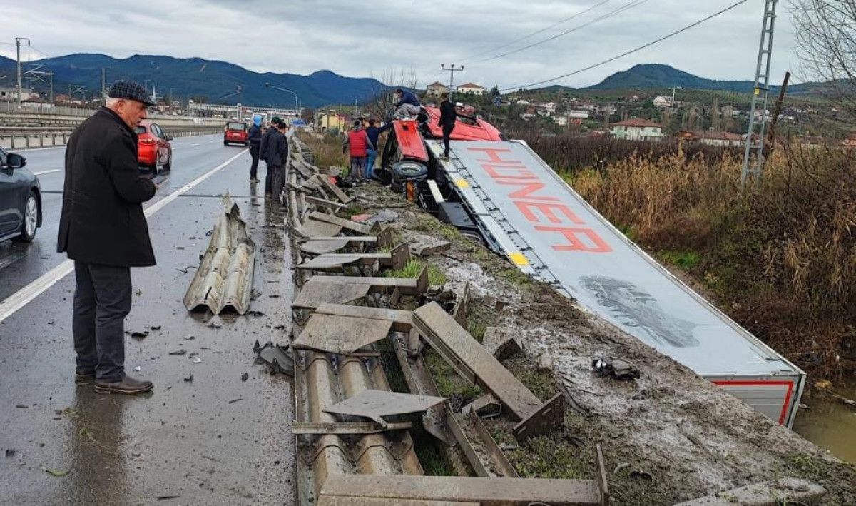 Sakarya’nın Pamukova ilçesinde D-650 kara yolu Mekece Mahallesi mevkii Bilecik istikametinde meydana gelen kazada, H.E.Ç. idaresindeki 34 GBJ 861 dorse plakalı tır, sürücüsünün direksiyon hakimiyeti kaybetmesi neticesinde kontrolden çıkarak yol kenarına devrildi.