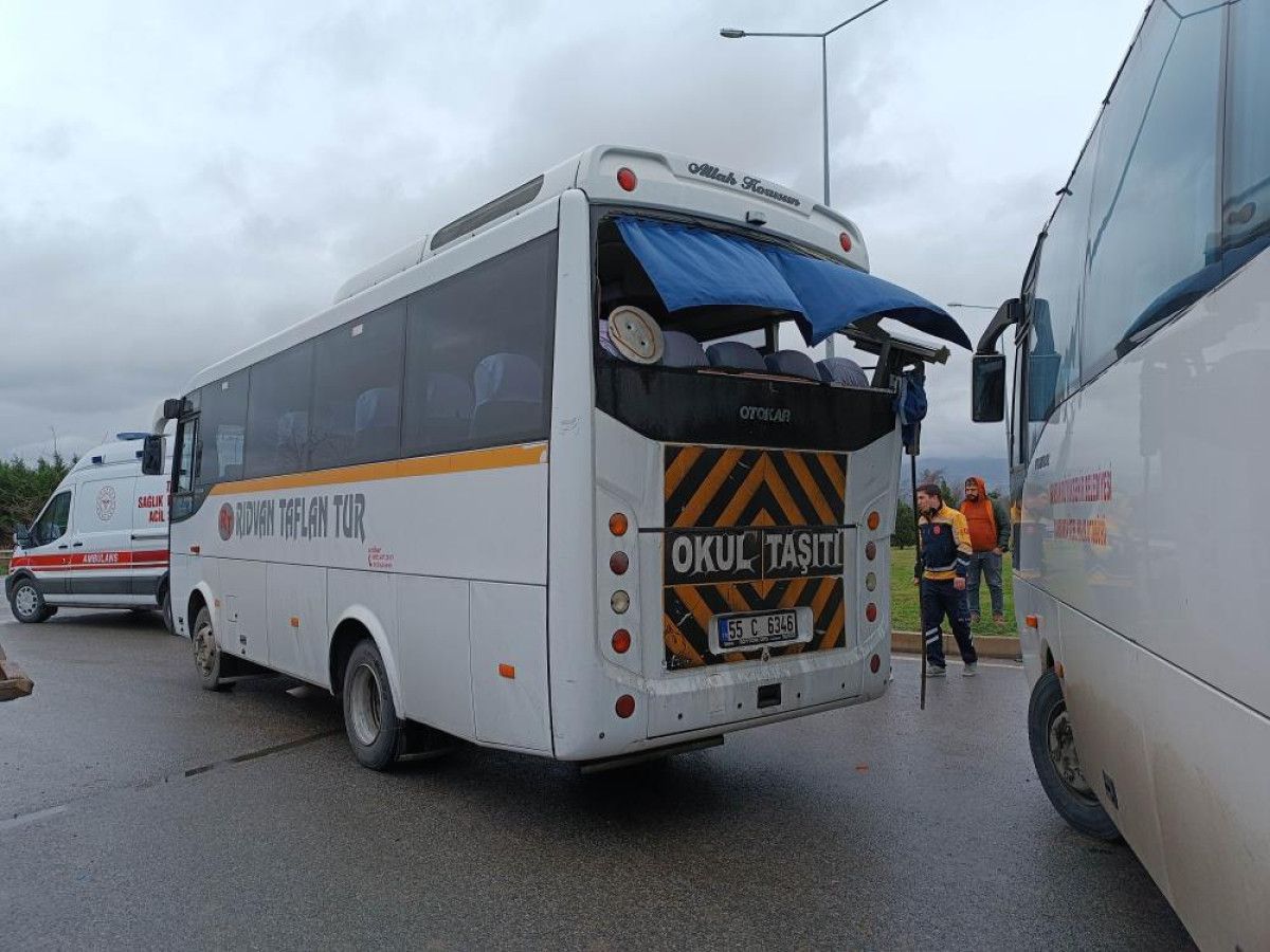 Kavşağa dönüş yapmak isteyen tır, sol seritten gelen ve anaokulu öğrencilerini taşıyan midibüsü sıkıştırdı.