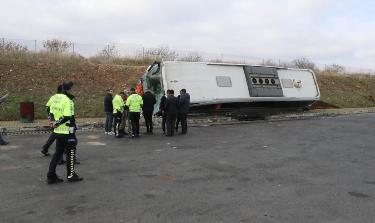 Çarpmanın etkisiyle kontrolden çıkan otobüs, devrilerek yan yattı.