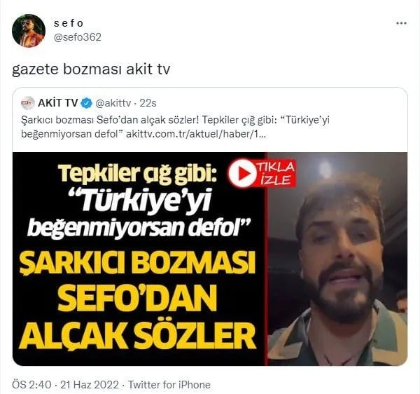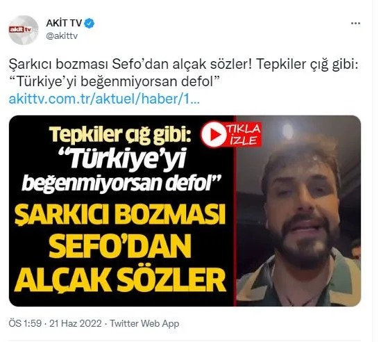 ‘Şarkıcı bozması Sefo’ tabirlerini kullanan Yeni Akit, “Vatandaşlar, ‘Türkiye’yi beğenmiyorsan defol’ tabirleriyle müzikçi modülüne haddini bildirdi” dedi.