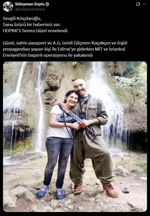 Soylu, Semra Güzel’in fotoğrafını paylaşarak attığı tweette, “Sevgili Kılıçdaroğlu, sana üzücü bir haberimiz var: HDPKK’lı Semra Güzel enselendi” ifadelerini kullanıyordu.