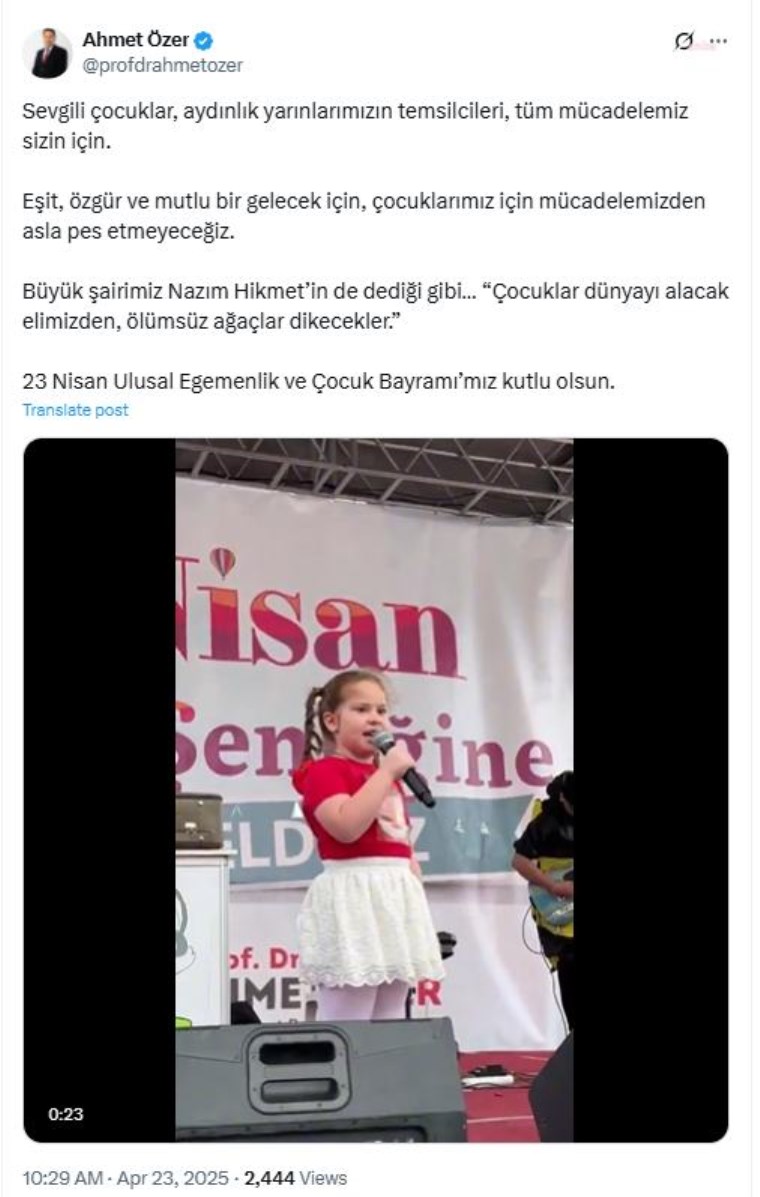 Esenyurt belediye başkanlığı görevini yürütürken 30 Ekim’de tutuklanan Ahmet Özer, “Sevgili çocuklar, aydınlık yarınlarımızın temsilcileri, tüm mücadelemiz sizin için.” sözleriyle başlayan mesajını önceki 23 Nisan kutlamalarındaki görüntülerden oluşan bir video ile şöyle paylaştı: