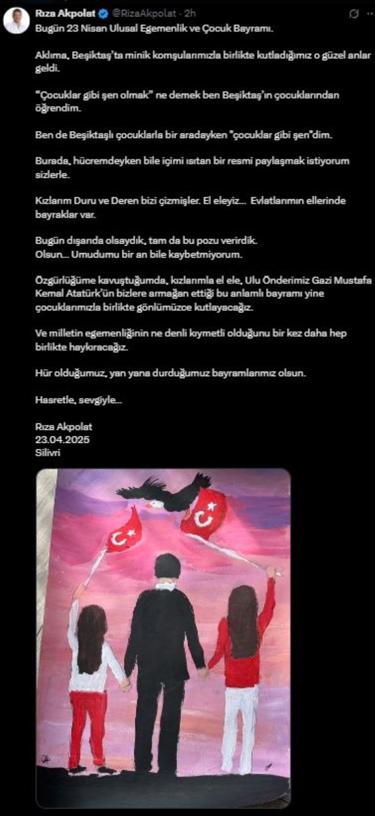 “Bugün 23 Nisan Ulusal Egemenlik ve Çocuk Bayramı. Aklıma, Beşiktaş’ta minik komşularımızla birlikte kutladığımız o güzel anlar geldi. ‘Çocuklar gibi şen olmak’ ne demek ben Beşiktaş’ın çocuklarından öğrendim. Ben de Beşiktaşlı çocuklarla bir aradayken ‘çocuklar gibi şen’dim. Burada, hücremdeyken bile içimi ısıtan bir resmi paylaşmak istiyorum sizlerle. Kızlarım Duru ve Deren bizi çizmişler. El eleyiz… Evlatlarımın ellerinde bayraklar var. Bugün dışarıda olsaydık, tam da bu pozu verirdik. Olsun… Umudumu bir an bile kaybetmiyorum. Özgürlüğüme kavuştuğumda, kızlarımla el ele, Ulu Önderimiz Gazi Mustafa Kemal Atatürk’ün bizlere armağan ettiği bu anlamlı bayramı yine çocuklarımızla birlikte gönlümüzce kutlayacağız. Ve milletin egemenliğinin ne denli kıymetli olduğunu bir kez daha hep birlikte haykıracağız. Hür olduğumuz, yan yana durduğumuz bayramlarımız olsun. Hasretle, sevgiyle… Rıza Akpolat, 23.04.2025, Silivri”