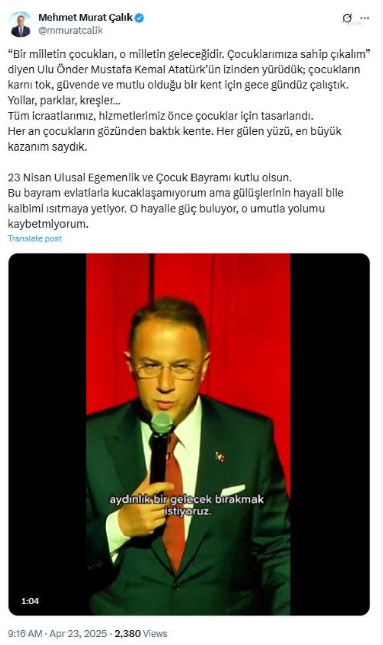 19 Mart’ta gözaltına alınan ve 23 Mart’ta tutuklanan Beylikdüzü Belediye Başkanı Mehmet Murat Çalık da 23 Nisan mesajını kısa bir video ile paylşatı. Çalık’ın çocuklara mesajı ise şu şekilde: