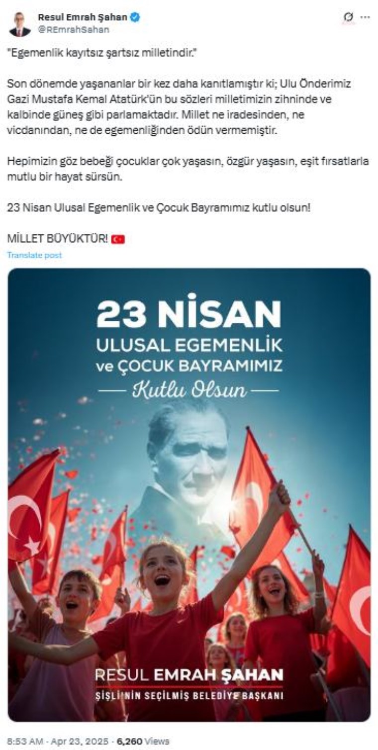 “Kent Uzlaşısı” soruşturması kapsamında tutuklanan Şişli Belediye Başkanı Resul Emrah Şahan’ın 23 Nisan mesajı şöyle: