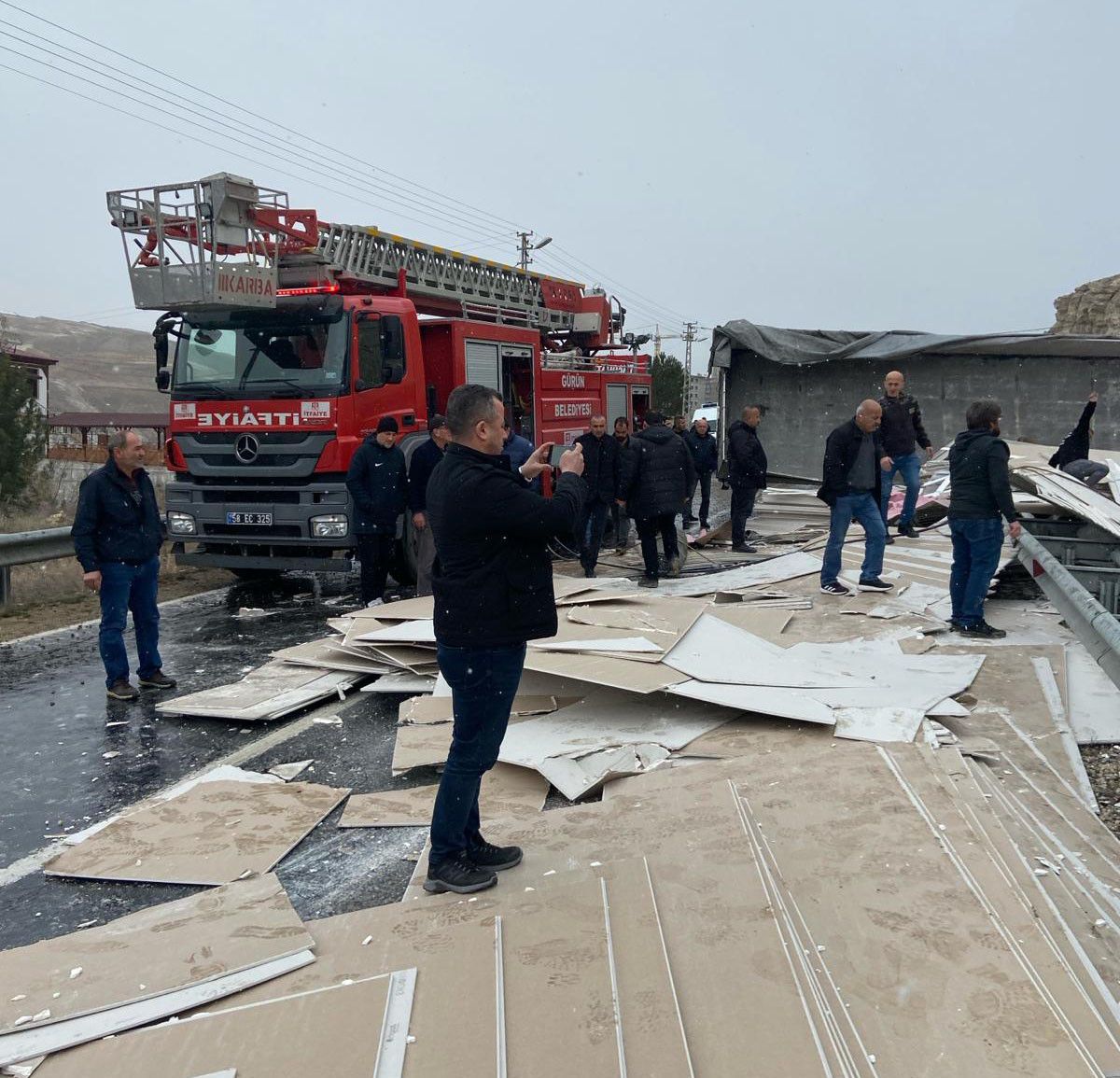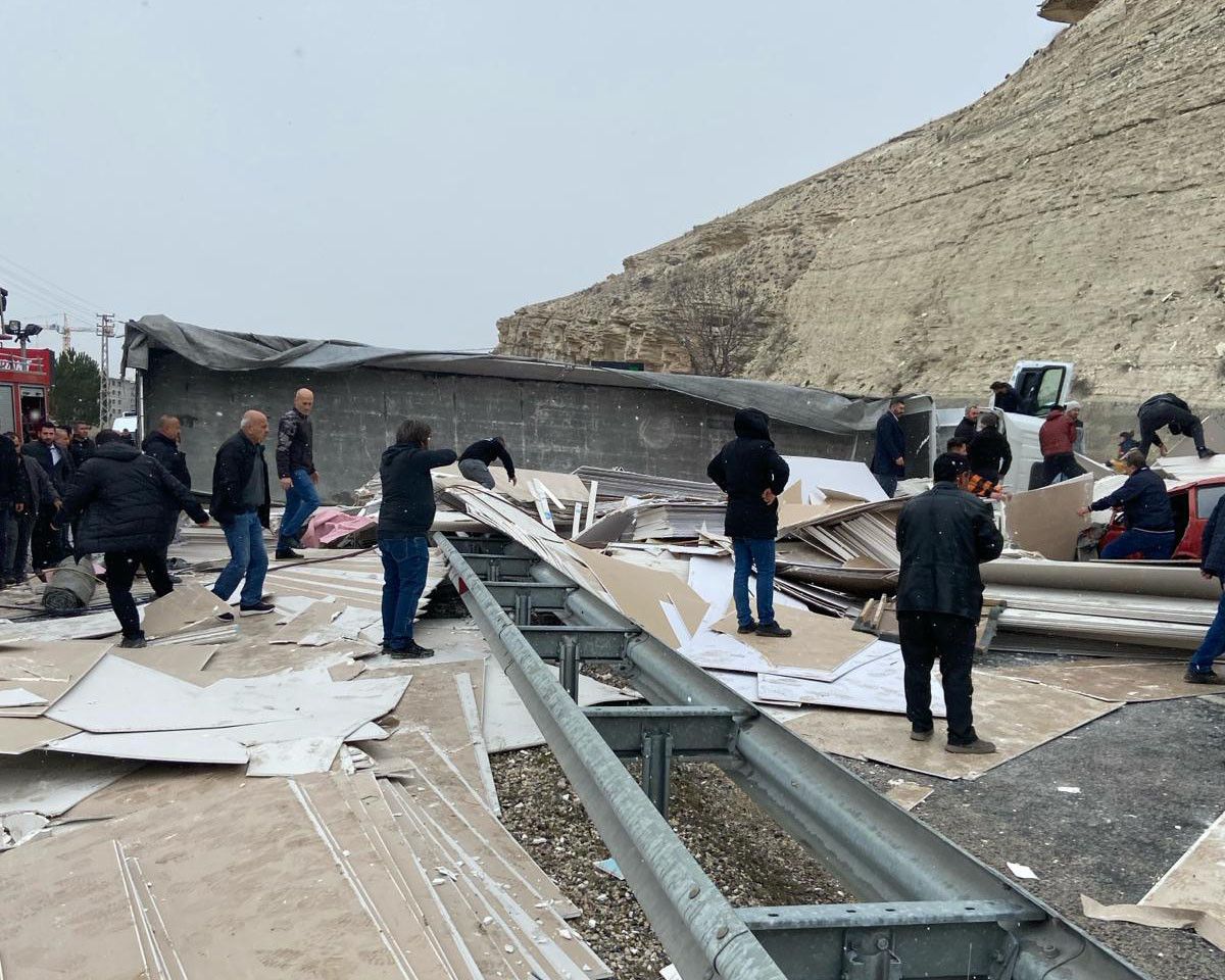 Sivas’ın Gürün İlçesi’nde, Gürün-Darende kara yolunun Çayboyu Mahallesi yakınlarında Mehmet Adımlı yönetimindeki 50 ADF 035 plakalı alçıpan yüklü tır yağış nedeniyle kayganlaşan yolda sürücünün direksiyon hakimiyetini kaybetmesi sonucu devrildi.