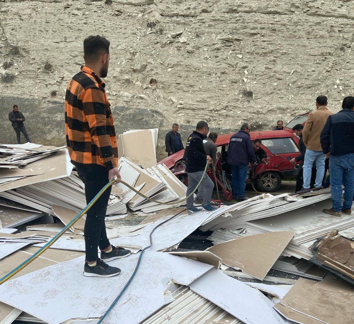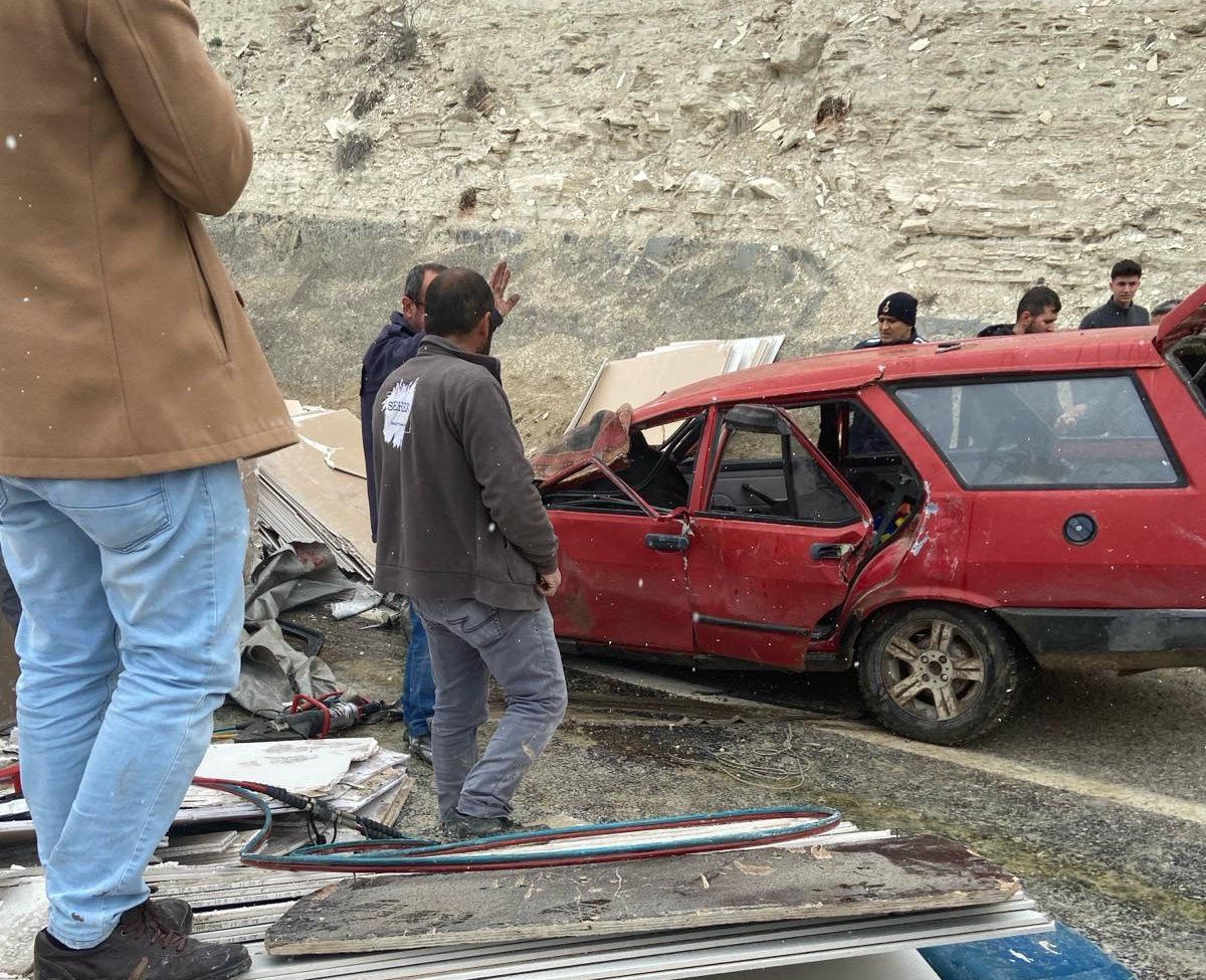 Tırın üzerindeki alçıpan malzemeler karşı yönden gelen Çetin Karaşin yönetimindeki 01 LE 212 plakalı otomobilin üzerine devrildi.