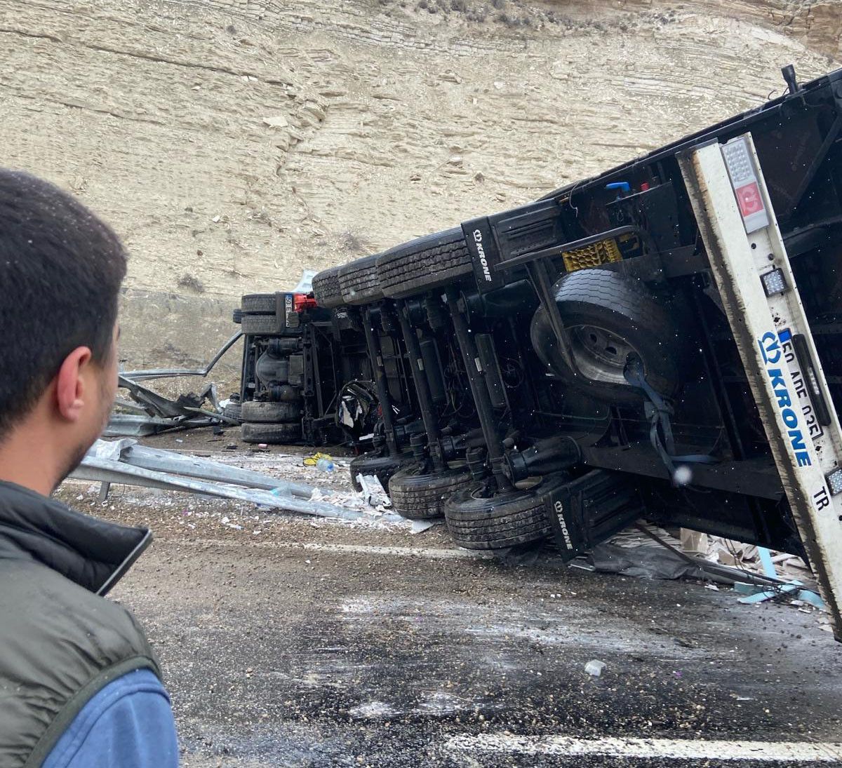 Sivas’ın Gürün İlçesi’nde, Gürün-Darende kara yolunun Çayboyu Mahallesi yakınlarında Mehmet Adımlı yönetimindeki 50 ADF 035 plakalı alçıpan yüklü tır yağış nedeniyle kayganlaşan yolda sürücünün direksiyon hakimiyetini kaybetmesi sonucu devrildi.