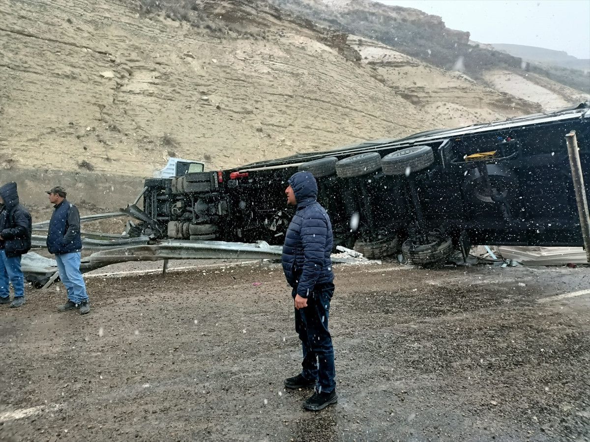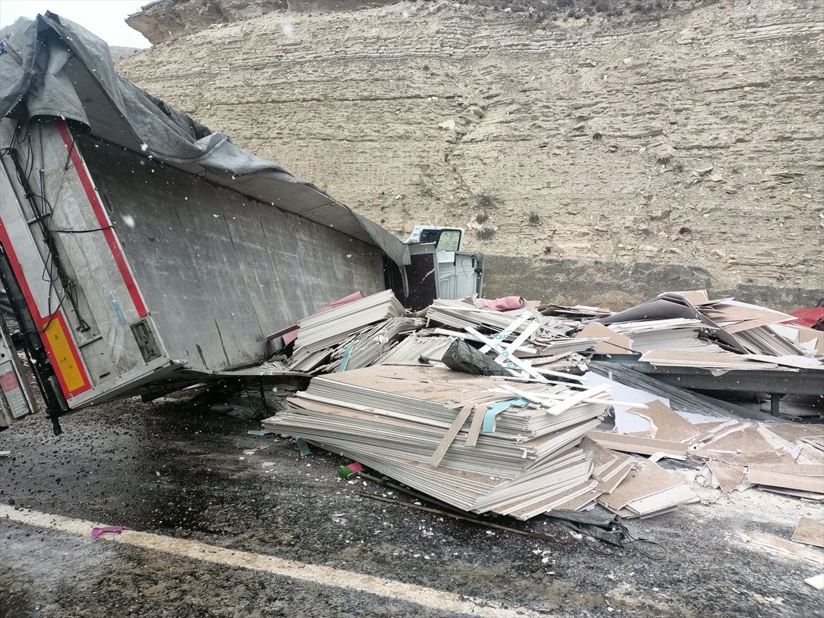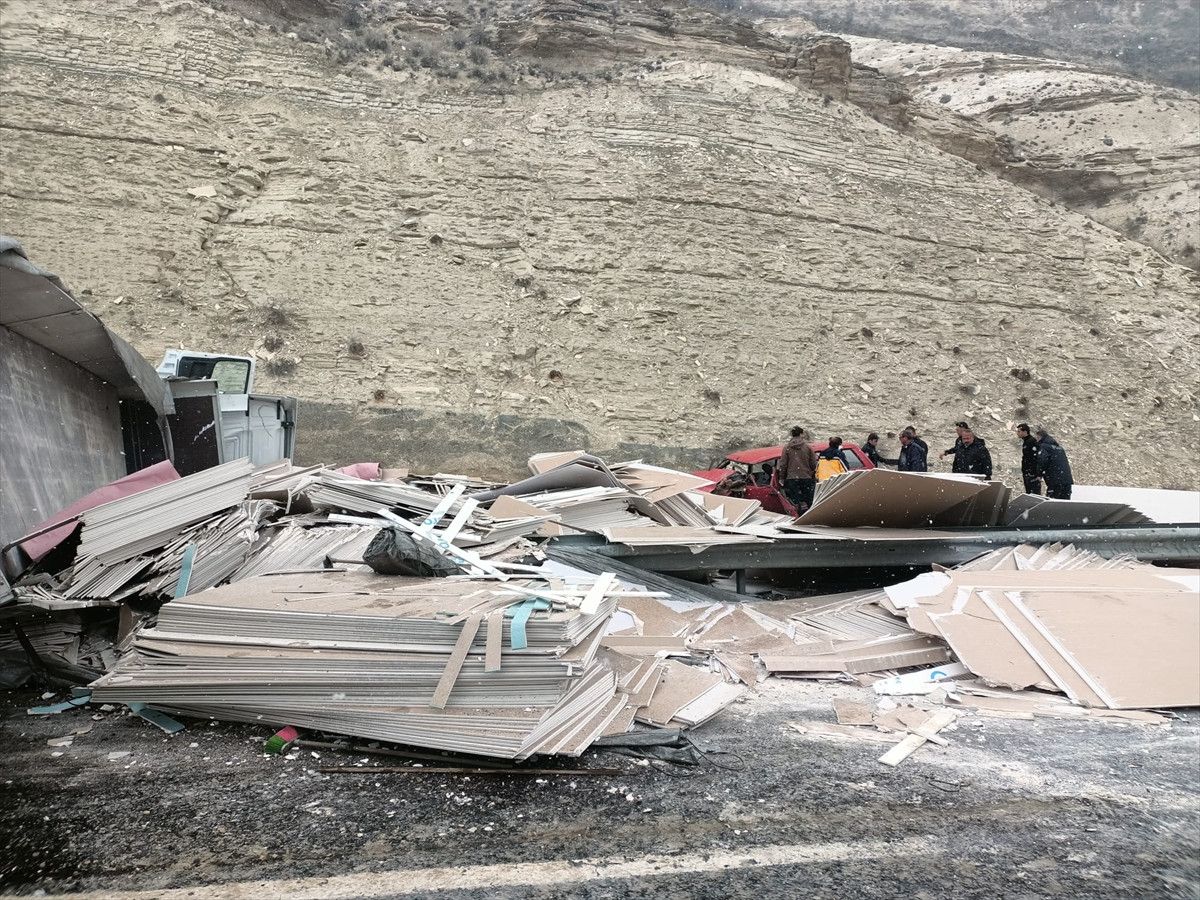 Sivas’ta M.A. yönetimindeki 50 EY 034 plakalı alçıpan yüklü tır, Gürün-Darende kara yolunun Çayboyu Mahallesi yakınlarında karşı şeridine geçerek devrildi. Bu sırada Ç.K. yönetimindeki 01 LE 212 plakalı otomobil, tırın dorsesinden düşen alçıpanların altında kaldı.