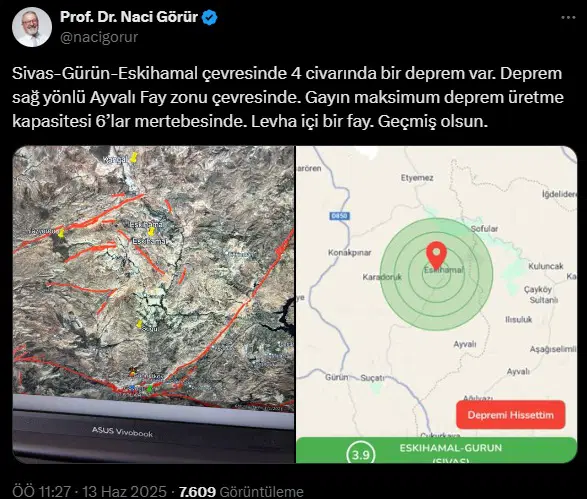 X hesabından yaptığı haritalı paylaşımda, “Sivas-Gürün-Eskihamal çevresinde 4 civarında bir deprem var. Deprem sağ yönlü Ayvalı Fay zonu çevresinde. Fayın maksimum deprem üretme kapasitesi 6’lar mertebesinde. Levha içi bir fay. Geçmiş olsun” ifadelerini kullandı.