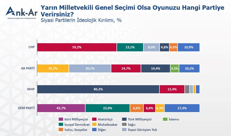 Ankara Araştırma ve Danışmanlık (ANK-AR) tarafından yapılan araştırmada siyasi partilerin ideolojik kırılımı ölçüldü.