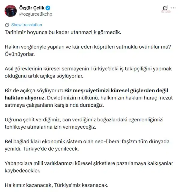 Çelik, konuya ilişkin sosyal medya hesabı üzerinden yaptığı açıklamada, “Halkın vergileriyle yapılan ve kar eden köprüleri satmakla övünülür mü? Övünüyorlar. Devletimizin mülkünü, halkımızın hakkını haraç mezat satmaya çalışanların karşısında duracağız. Uğruna şehit verdiğimiz, can verdiğimiz boğazlardaki egemenliğimizi tehlikeye atmalarına izin vermeyeceğiz” dedi.