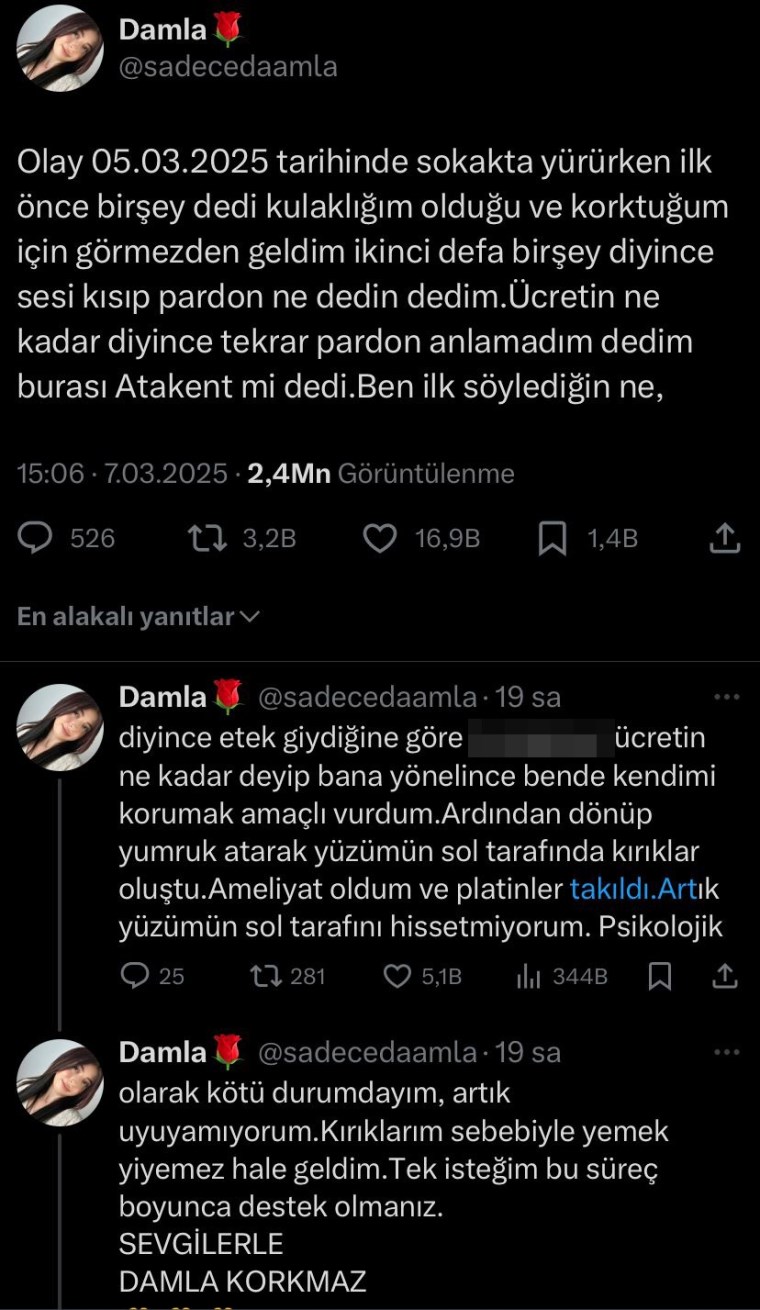 Hastanede tedavisi süren Damla Korkmaz, sosyal medya hesabından darp sonrası yüzünün fotoğrafını paylaşıp, “Olay 05.03.2025 tarihinde sokakta yürürken ilk önce bir şey dedi, kulaklığım olduğu ve korktuğum için görmezden geldim. İkinci defa bir şey deyince sesi kısıp pardon ne dedin, dedim. Ücretin ne kadar, deyince tekrar pardon anlamadım, dedim. Burası Atakent mi dedi. Ben ilk söylediğin ne deyince, etek giydiğine göre ücretin ne kadar deyip bana yönelince ben de kendimi korumak amaçlı vurdum. Ardından dönüp yumruk atarak yüzümün sol tarafında kırıklar oluştu. Ameliyat oldum ve platinler takıldı. Artık yüzümün sol tarafını hissetmiyorum. Psikolojik olarak kötü durumdayım, artık uyuyamıyorum. Kırıklarım sebebiyle yemek yiyemez hale geldim. Tek isteğim bu süreç boyunca destek olmanız” dedi.