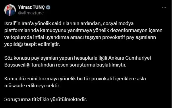 Bakan Tunç, sosyal medya hesabı üzerinden yaptığı paylaşımda, “İsrail’in İran’a yönelik saldırılarının ardından, sosyal medya platformlarında kamuoyunu yanıltmaya yönelik dezenformasyon içeren ve toplumda infial uyandırma amacı taşıyan provokatif paylaşımların yapıldığı tespit edilmiştir. Söz konusu paylaşımları yapan hesaplarla ilgili Ankara Cumhuriyet Başsavcılığı tarafından resen soruşturma başlatılmıştır. Kamu düzenini bozmaya yönelik bu tür provokatif içeriklere asla müsaade edilmeyecektir. Soruşturma titizlikle yürütülmektedir” dedi.