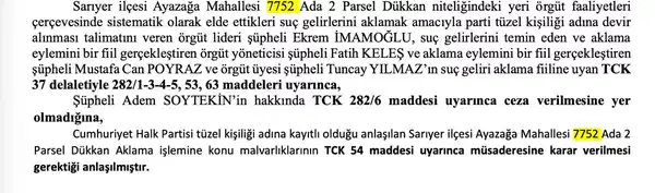 İddianamede, “Cumhuriyet Halk Partisi tüzel kişiliği adına kayıtlı olduğu anlaşılan Sarıyer ilçesi Ayazağa Mahallesi 7752 Ada 2 Parsel Dükkan Aklama işlemine konu malvarlıklarının TCK 54 maddesi uyarınca müsaderesine karar verilmesi gerektiği anlaşılmıştır” denildi.