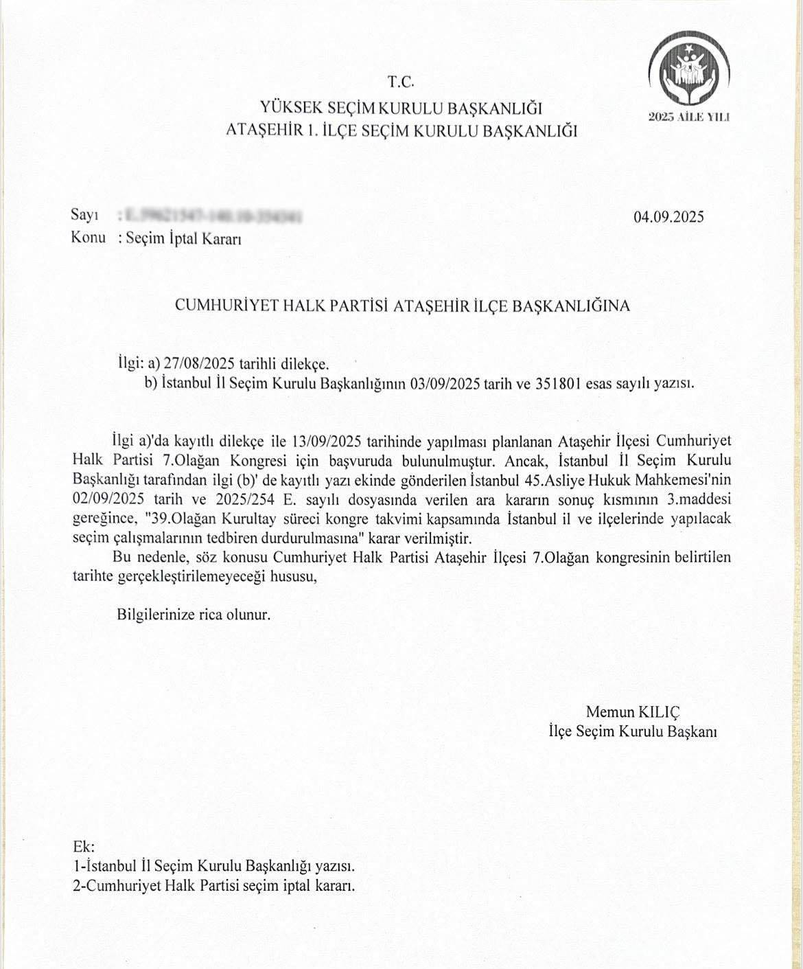 “13/09/2025 tarihinde yapılması planlanan Ataşehir İlçesi Cumhuriyet Halk Partisi 7. Olağan Kongresi için başvuruda bulunulmuştur. Ancak, İstanbul 45. Asliye Hukuk Mahkemesi’nin 02/09/2025 tarih ve 2025/254 E. sayılı dosyasında verilen ara kararın sonuç kısmının 3. maddesi gereğince, “39. Olağan Kurultay süreci kongre takvimi kapsamında İstanbul il ve ilçelerinde yapılacak seçim çalışmalarının tedbiren durdurulmasına” karar verilmiştir.