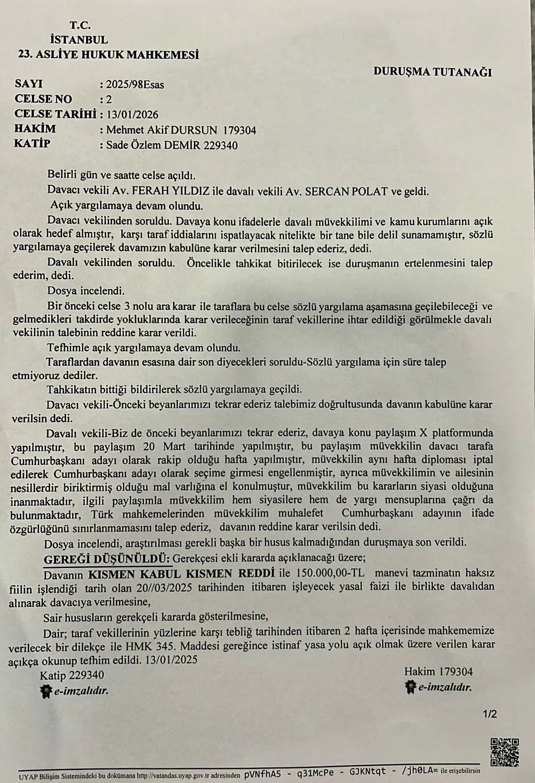 Davanın ‘kısmen kabul, kısmen reddedi’ne karar veren mahkeme; İmamoğlu’nun Erdoğan’a 150 bin lira tazminat ödemesine hükmetti.