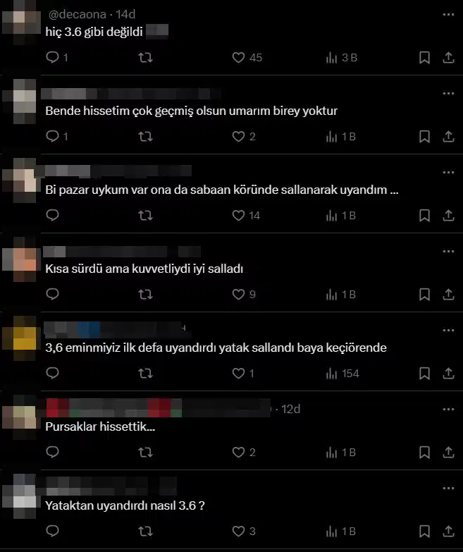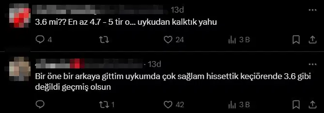 Birçok yurttaş, “3.6 mi? En az 4.7-5 tir o… uykudan kalktık yahu”, “Bir öne bir arkaya gittim uykumda çok sağlam hissettik Keçiören’de 3.6 gibi değildi geçmiş olsun”, “Bi pazar uykum var ona da sabahın köründe sallanarak uyandım” yorumlarını yaptı.