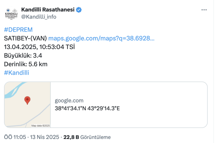 Kandilli Rasathanesi, Van’ın Satıbey ilçesinde 3.4 büyüklüğünde bir deprem meydana geldiğini duyurdu.