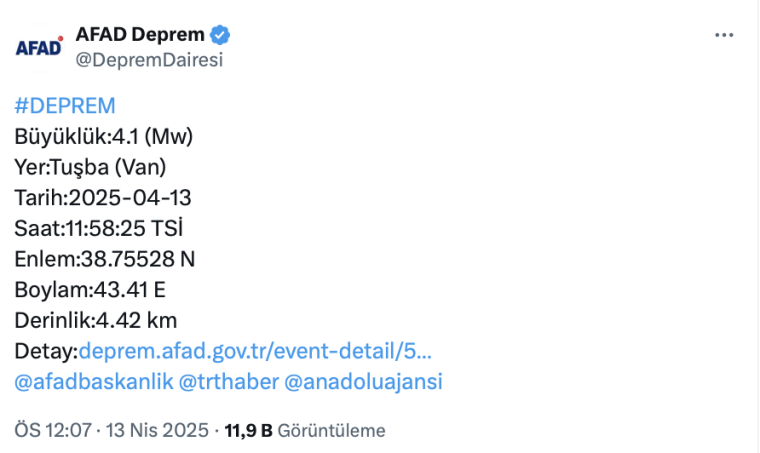 AFAD, Van’ın Tuşba ilçesinde 4.1 büyüklüğünde ikinci bir deprem meydana geldiğini açıkladı. Saat 11.58’de gerçekleşen depremin 4.42 km derinlikte olduğu bildirildi.