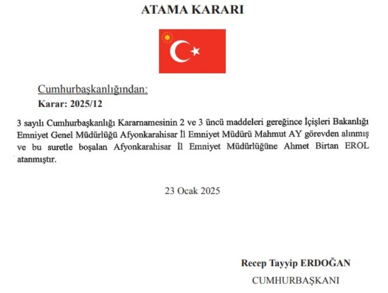 Resmi Gazete’de (24 Ocak 2025 Tarihli ve 32792 Sayılı) yayımlanan karara göre Afyonkarahisar İl Emniyet Müdürlüğü’nde değişiklik yapıldı.