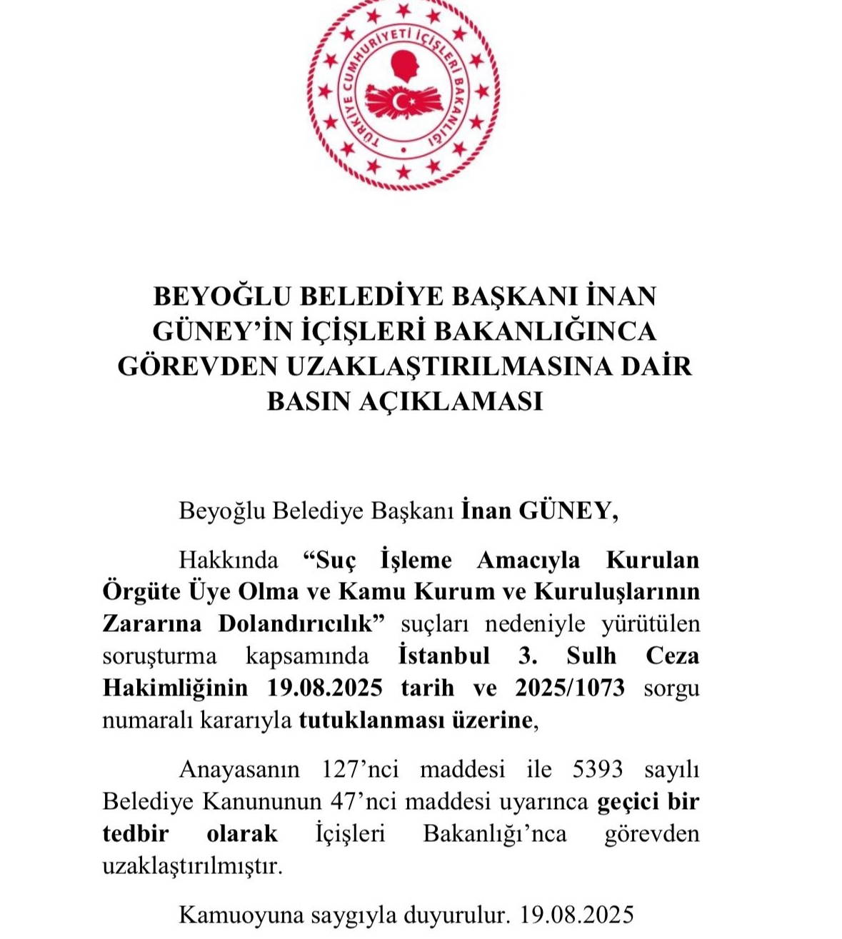 İstanbul Büyükşehir Belediyesi’ne yönelik 19 Mart günü başlayan operasyonların 9. dalgasında 15 Ağustos tarihinde gözaltına alınan ve daha sonra tutuklanan Beyoğlu Belediye Başkanı İnan Güney görevden uzaklaştırıldı.