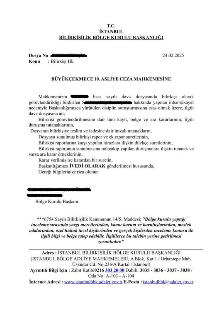 İstanbul Bilirkişilik Bölge Kurulu Başkanlığı, Büyükçekmece 10. Asliye Ceza Mahkemesi’ne gönderdiği resmi yazıyla, bir bilirkişi hakkında yürütülen disiplin soruşturmasına ilişkin dava dosyasındaki belgelerin ivedilikle kendilerine iletilmesini talep etti.