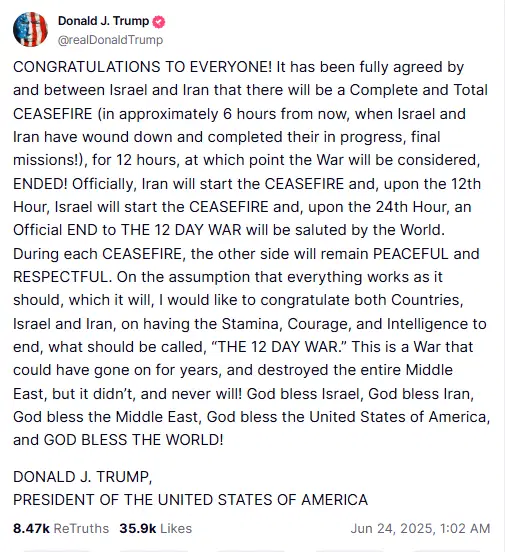 “HERKESE TEBRİKLER! İsrail ve İran arasında, yaklaşık 6 saat içinde (her iki tarafın da hâlihazırda devam eden son operasyonlarını tamamlamasının ardından) geçerli olacak şekilde, TAM VE KAPSAMLI BİR ATEŞKES konusunda tam mutabakat sağlanmıştır!