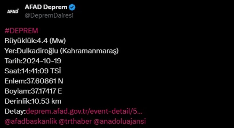 Afet ve Acil Durum Yönetimi Başkanlığı (AFAD), saat 14.41’de, Kahramanmaraş’ın Dulkadiroğlu ilçesinde 4.4 büyüklüğünde bir deprem meydana geldiğini bildirdi.