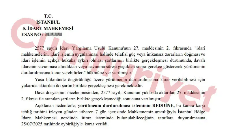 Lisans diplomasının ardından yüksek lisans diploması da iptal edilen Ekrem İmamoğlu’nun, lisans diplomasının iptaline karşı İstanbul 5. İdare Mahkemesi’nde açtığı davada yürütmenin durdurulması istemine red kararı verildi.