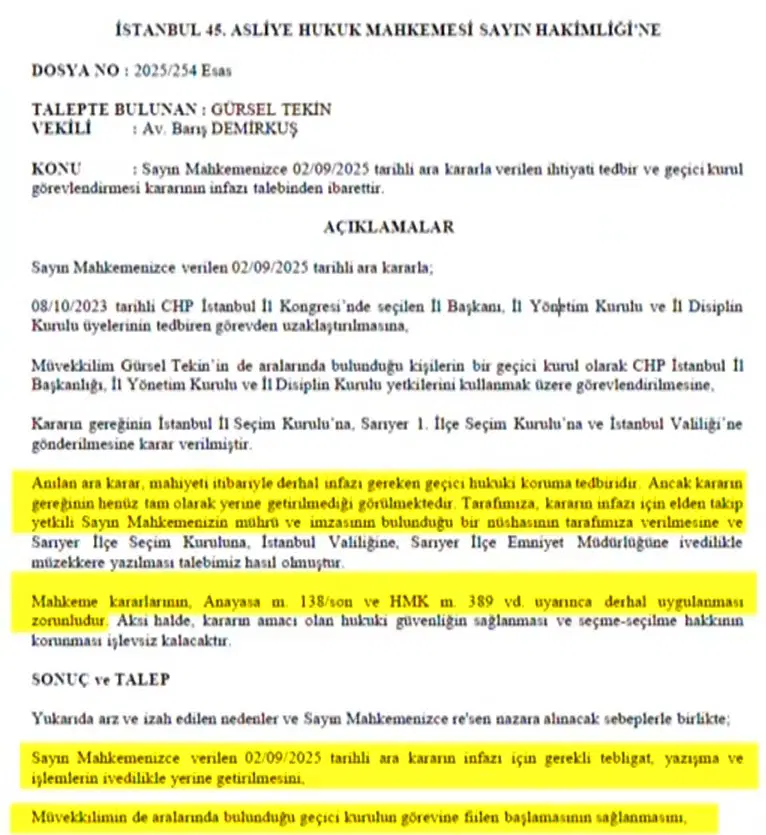 CHP İstanbul İl Yönetimi’ne mahkeme tarafından kayyum olarak görevlendirilen Gürsel Tekin, CHP il binasına gitmeden önce “Görevi yerine getirebilmem için kararın örneğini bana da verin” ifadelerini kullanarak mahkemeye başvurdu.