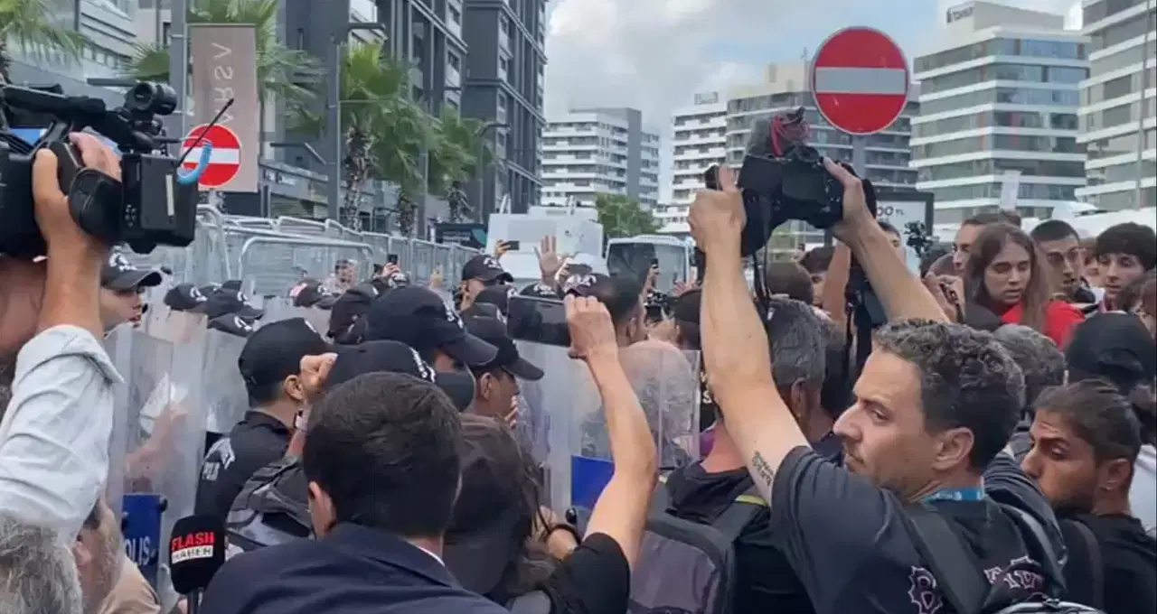 Görüntülerde CHP milletvekili Deniz Yavuzyılmaz’ın polisle barikat arasında sıkıştığı görüldü.