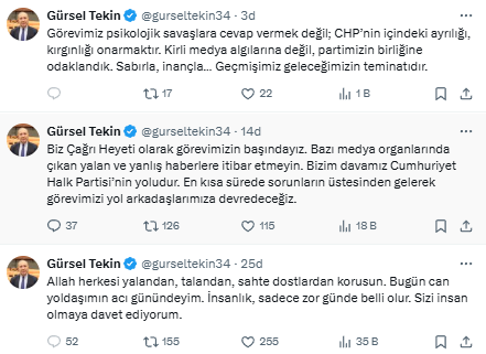 Görevimiz psikolojik savaşlara cevap vermek değil; CHP’nin içindeki ayrılığı, kırgınlığı onarmaktır. Kirli medya algılarına değil, partimizin birliğine odaklandık. Sabırla, inançla… Geçmişimiz geleceğimizin teminatıdır.”
