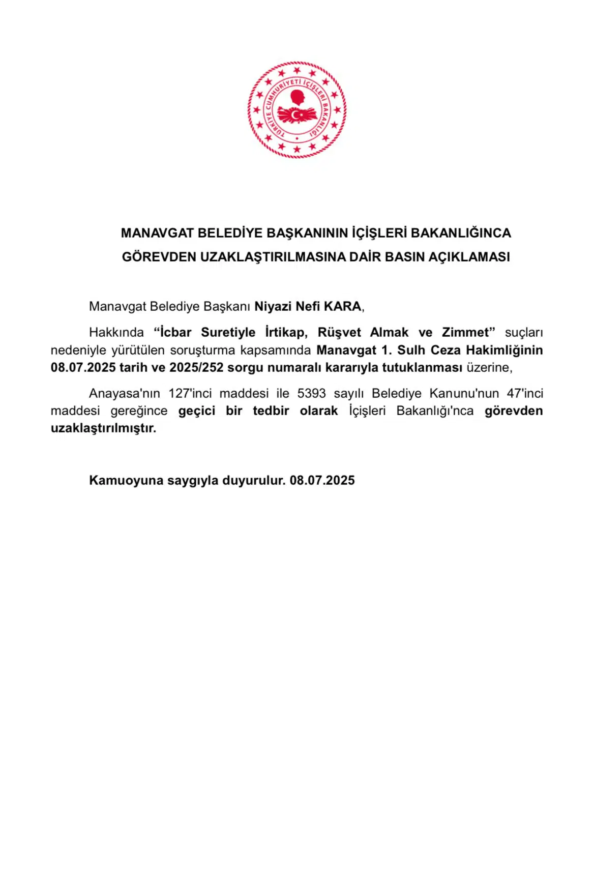 “Manavgat Belediye Başkanı Niyazi Nefi Kara, hakkında ‘icbar suretiyle irtikap, rüşvet almak ve zimmet’ suçları nedeniyle yürütülen soruşturma kapsamında Manavgat 1. Sulh Ceza Hakimliğinin 8 Temmuz 2025 tarih ve 2025/252 sorgu numaralı kararıyla tutuklanması üzerine, Anayasa’nın 127’nci maddesi ile 5393 sayılı Belediye Kanunu’nun 47’inci maddesi gereğince geçici bir tedbir olarak İçişleri Bakanlığınca görevden uzaklaştırılmıştır.”