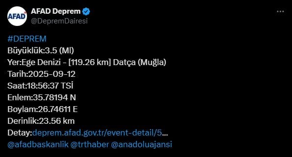 Afet ve Acil Durum Yönetimi Başkanlığı (AFAD) verilerine göre, Muğla’nın Datça ilçesi açıklarında 3.5 büyüklüğünde deprem meydana geldi.