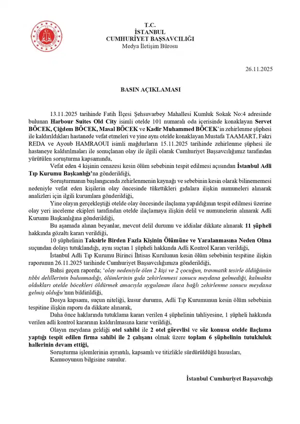 İstanbul Cumhuriyet Başsavcılığı’ndan yapılan açıklamaya göre, tutuklanan 4 kişi hakkında tahliye kararı verildi. Bir kişinin ise adli kontrol kararının kaldırıldığı duyuruldu.