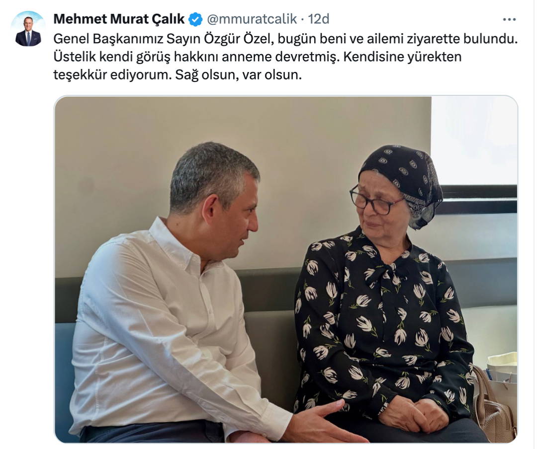 CHP lideri Özel’in açıklaması sonrası Mehmet Murat Çalık’ın sosyal medya hesabından yapılan paylaşımda, “Genel Başkanımız Sayın Özgür Özel, bugün beni ve ailemi ziyarette bulundu. Üstelik kendi görüş hakkını anneme devretmiş. Kendisine yürekten teşekkür ediyorum. Sağ olsun, var olsun” ifadelerine yer verildi.