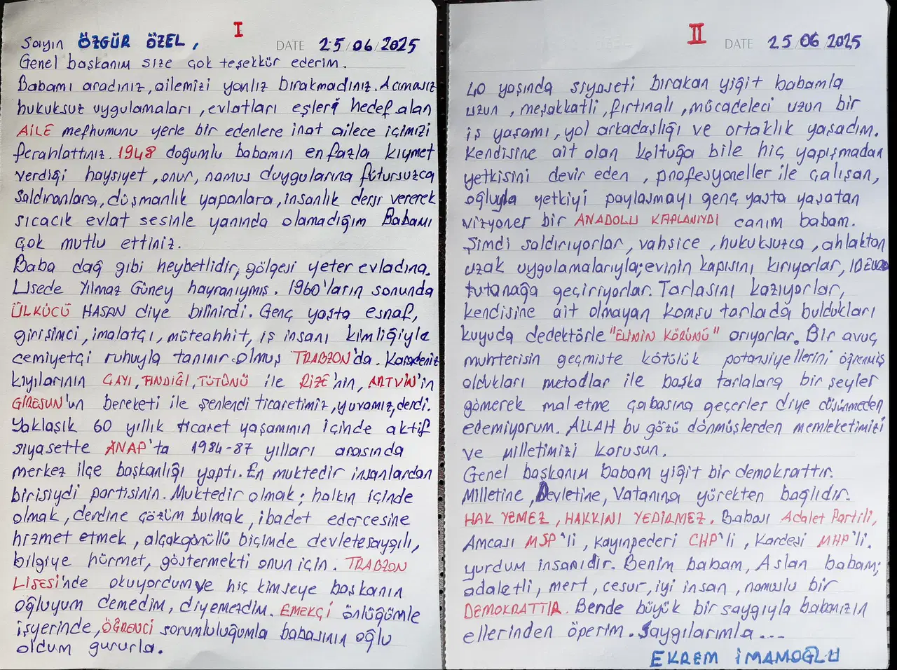 Cumhuriyet Halk Partisi Genel Başkanı Özgür Özel, tutuklu bulunan İBB Başkanı ve CHP’nin cumhurbaşkanı adayı Ekrem İmamoğlu’nun babası için yazdığı mektubu sosyal medya hesabından paylaştı.